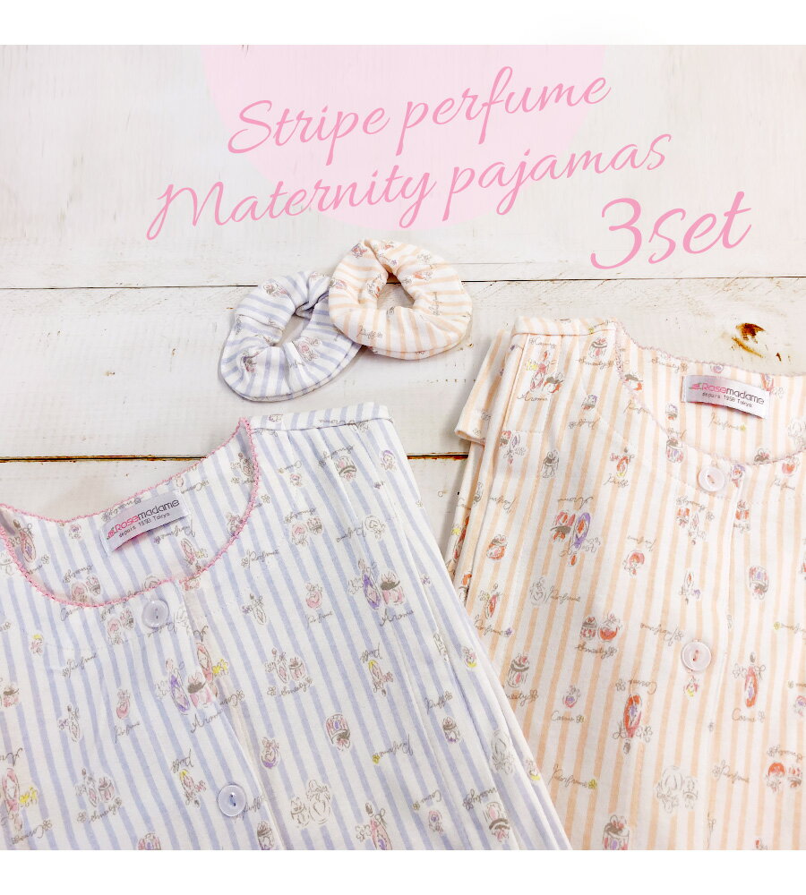 ストライプにパフューム柄が施され とってもキュートで優しい印象のデザイン 胸部左右に授乳口がついているので寝たままでも 授乳が楽ちんです。