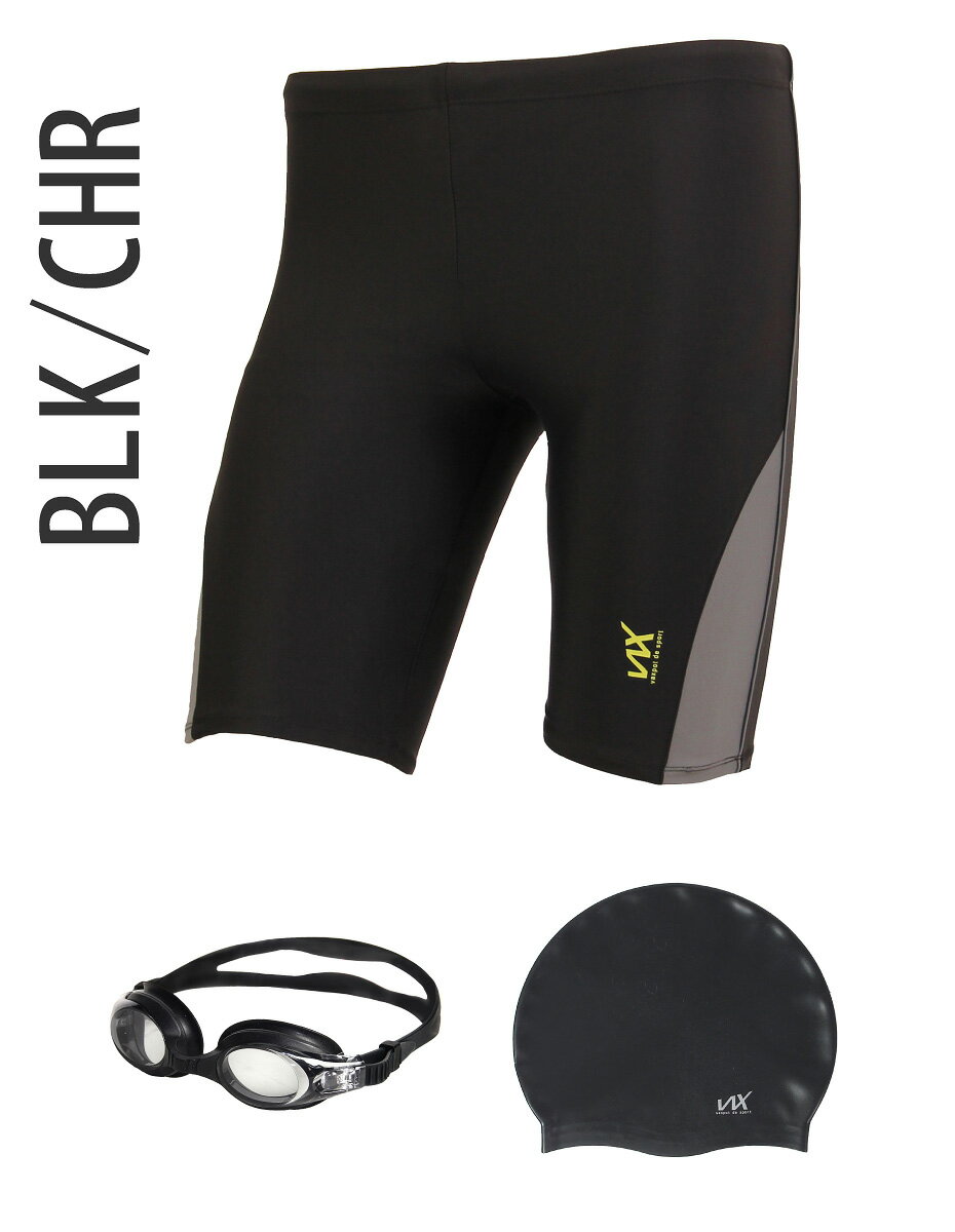 適度なフィット感とタイトなシルエットの VAXPOT フィットネス水着 セット メンズ 3点セット ベーシック なデザインの フィットネス水着 に スイムゴーグル と シリコンキャップ がセットになっており、これから スイミング を始める方にぴったり。