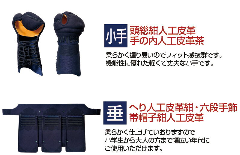 商品詳細 素材 面・・・面金IBB軽合金・面帽子紺人工皮革 耳穴付・面布団ナナメ刺し 面金:IBB軽合金 胴・・・鬼雲飾2本足返しべり・黒胴(S.M)・50本型黒胴(L)60本型黒胴(XL) 小手・・頭総紺人工皮革・手の内人口皮革茶 垂・・・へり人工皮革・帯帽子紺人工皮革・六段手飾 サイズ サイズ表をご覧ください。